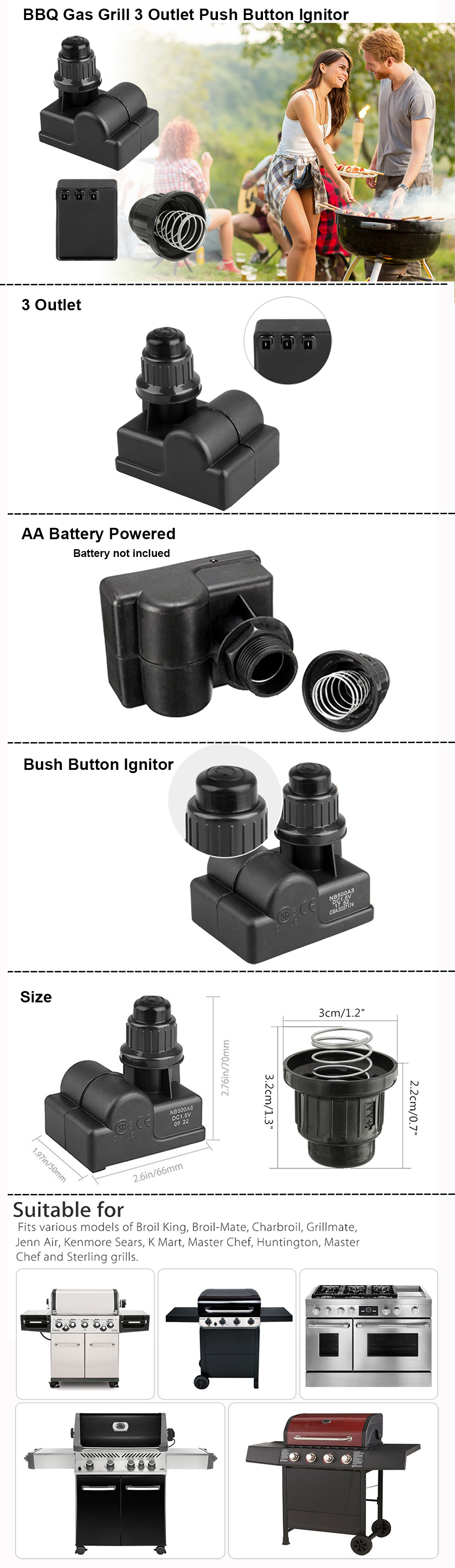 DescriptionProduct Name:Battery igniter Item No:DHLG-12A This battery ignitor replaces the older style piezo ignitor.It requires 1XAA battery(not include) and a single spark is generated on pushing the button or alternativerly by holding down the button will create a continuous spark. This ignitor is design for a 3 burner.