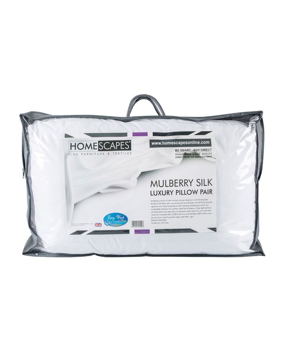 Suitable for all sleepers, these pillows are naturally anti-allergenic and anti-dust mite. Encased within a 200 thread count 100% cotton cover, these pillows are breathable and feel cool and soft to the touch. Part of the Homescapes range of Mulberry silk bedding, pair with the mattress topper and duvet for ultimate comfort when you sleep. Pack includes 2 pillows.