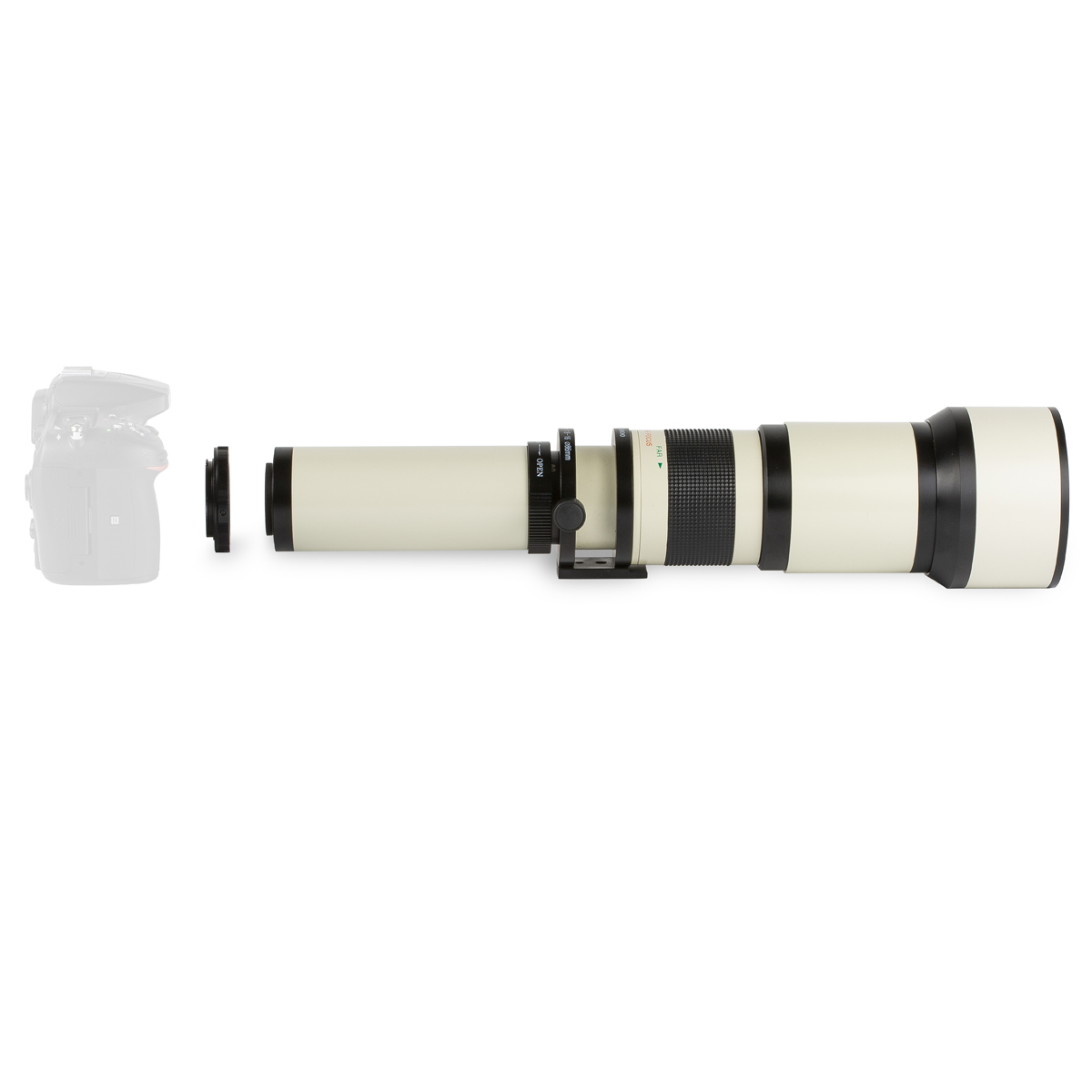 When combined with the included T-mount to fit your camera system, this super telephoto works on both "full frame" cameras as well as the "APS-C" style digital SLR cameras. You can use the lens in "M" manual exposure mode or "A" aperture-priority mode only.