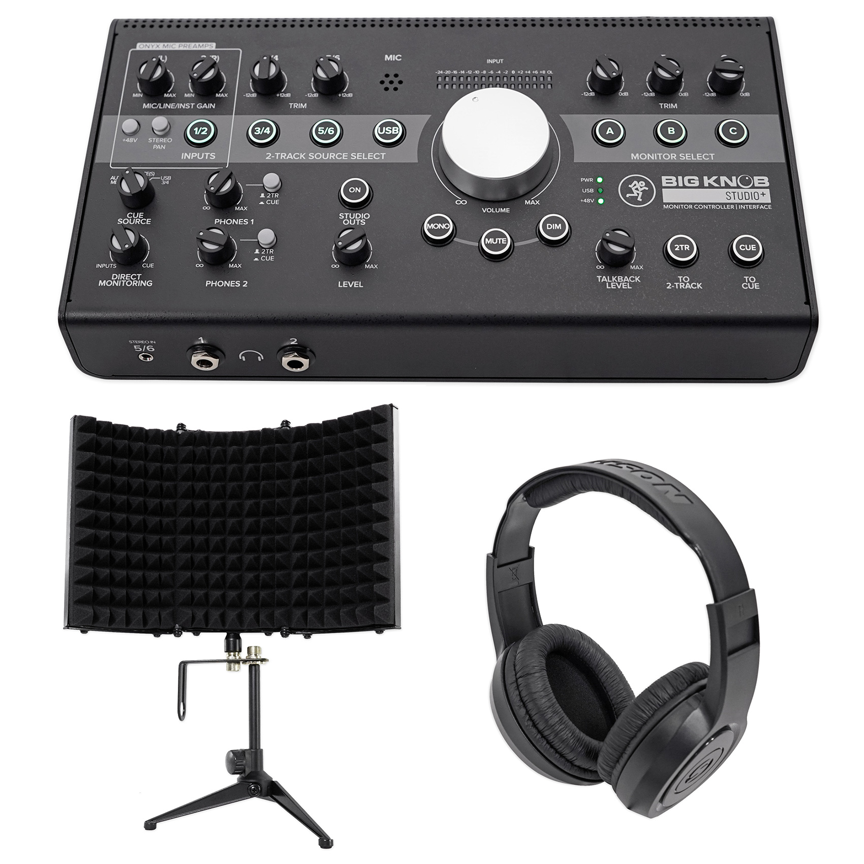 Package: Mackie Big Knob Studio Plus 4x3 Studio Monitor Controller with 192kHz USB Input and Output + Rockville RMF1 Studio Microphone Isolation Shield with Sound Dampening Foam + Samson SR350 Over Ear Closed Back Studio Monitoring Headphones