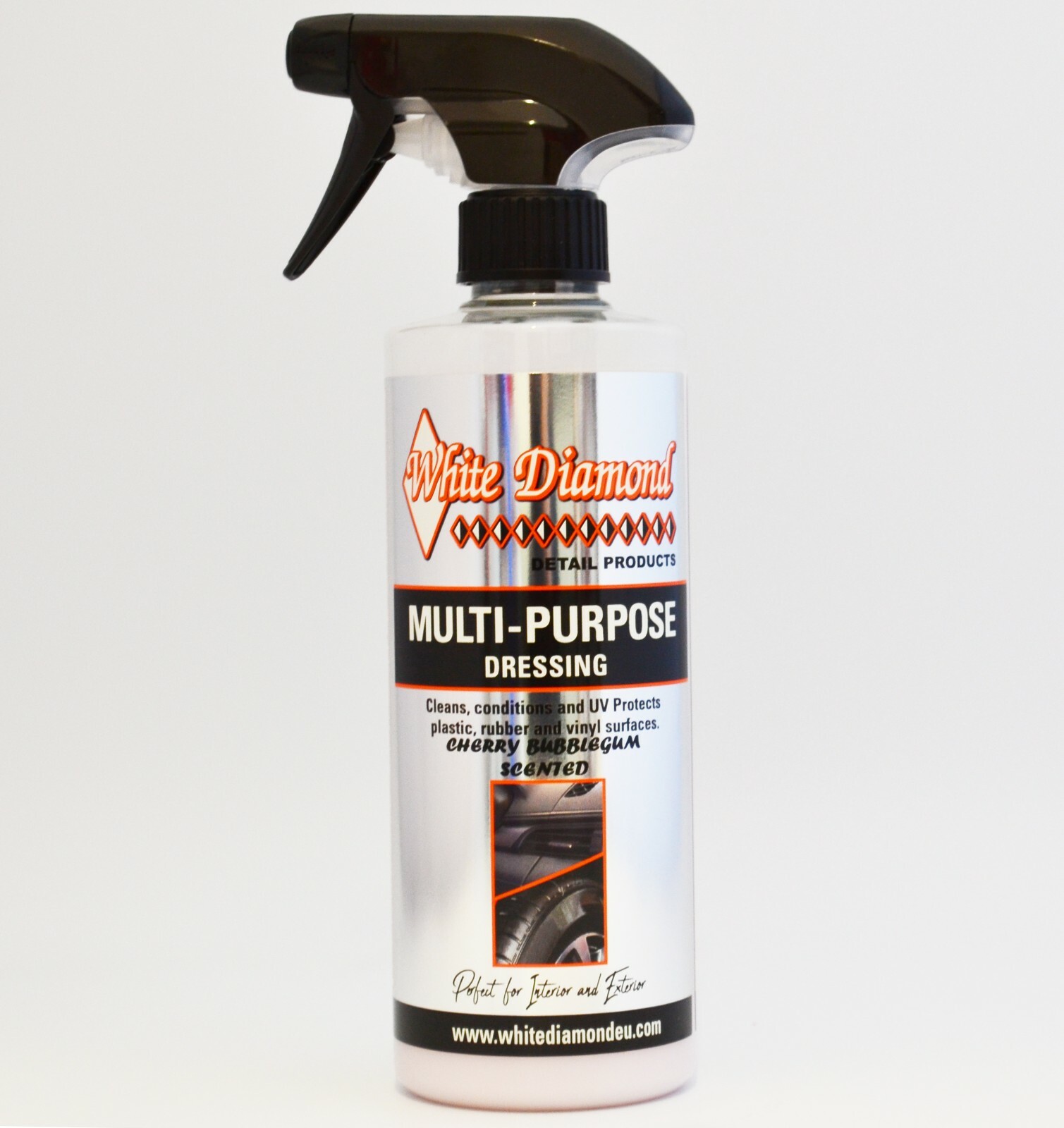 White Diamond Detail Products Spray Dressing Cherry/Bubblegum Scented to leave the interior plastics clean and with a shine, leaving a long lasting scent - 500ml
