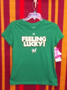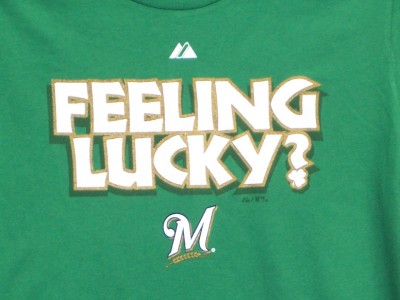 You would be lucky to win this unique, yet official, Milwaukee Brewers St. Patrick's Day shirt (it has a shamrock under the ?). Not only will you show your support on St. Patrick's Day, but you will also stand out in green next summer amid the sea of navy and blue at Miller Park. Make Cubs, Cardinals, & Reds green with envy as you cheer your team towards the World Series this year. You'll look & feel lucky when you wear this awesome Milwaukee Brewers t-shirt! Support the Brewers in your own distinctive way with their official, MLB Genuine Merchandise green t-shirt by Majestic.