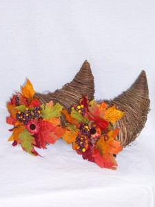 Ahh, Thanksgiving Day. We have so many blessings, shouldn't we blow the horn of plenty? This Cornucopia centerpiece seems to be made of vine (could be man-made) and has colorful synthetic floral & berry arrangement.