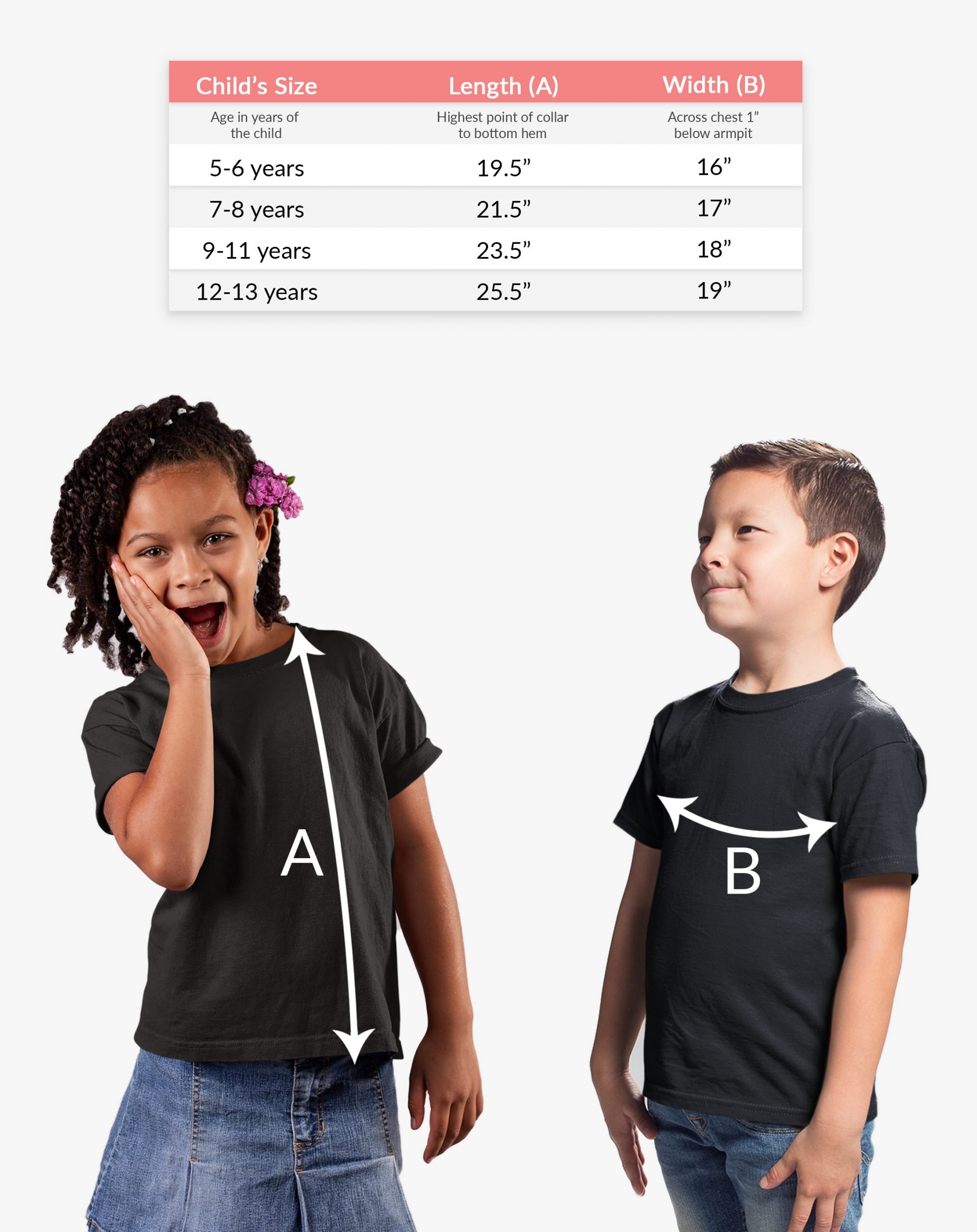 | Child's Size | To Fit Age | Width (A) | Length (B) |