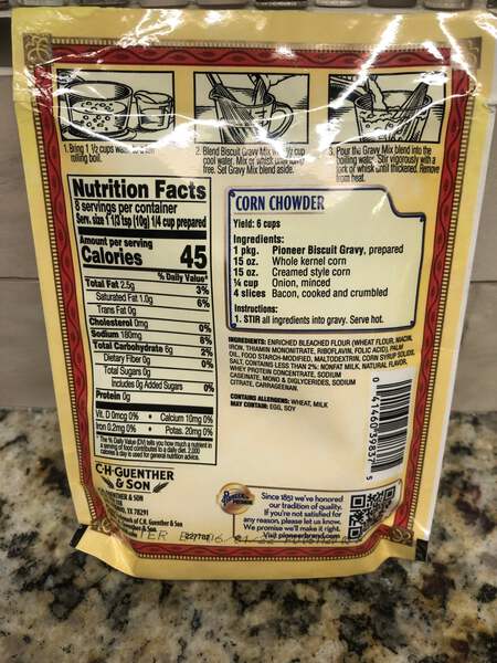 Use the Pioneer Brand Biscuit Gravy Mix, 2.75 oz to make a yummy tasting white gravy. This easy-to-prepare dish can be paired with many types of food such as eggs, mashed potatoes or biscuits. Use this quality baking mix to add flavor to other recipes such as country corn chowder.