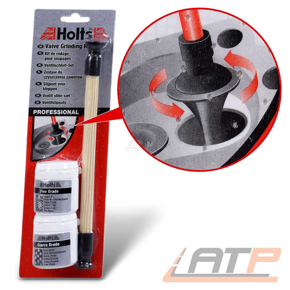 Holts Paste zum Einschleifen der Ventile an Motoren. Mit der groben Vorschleifpaste entfernen Sie hartnäckige Ablagerungen, mit der feinen Nachschleifpaste erhalten Sie eine glatte Oberfläche.