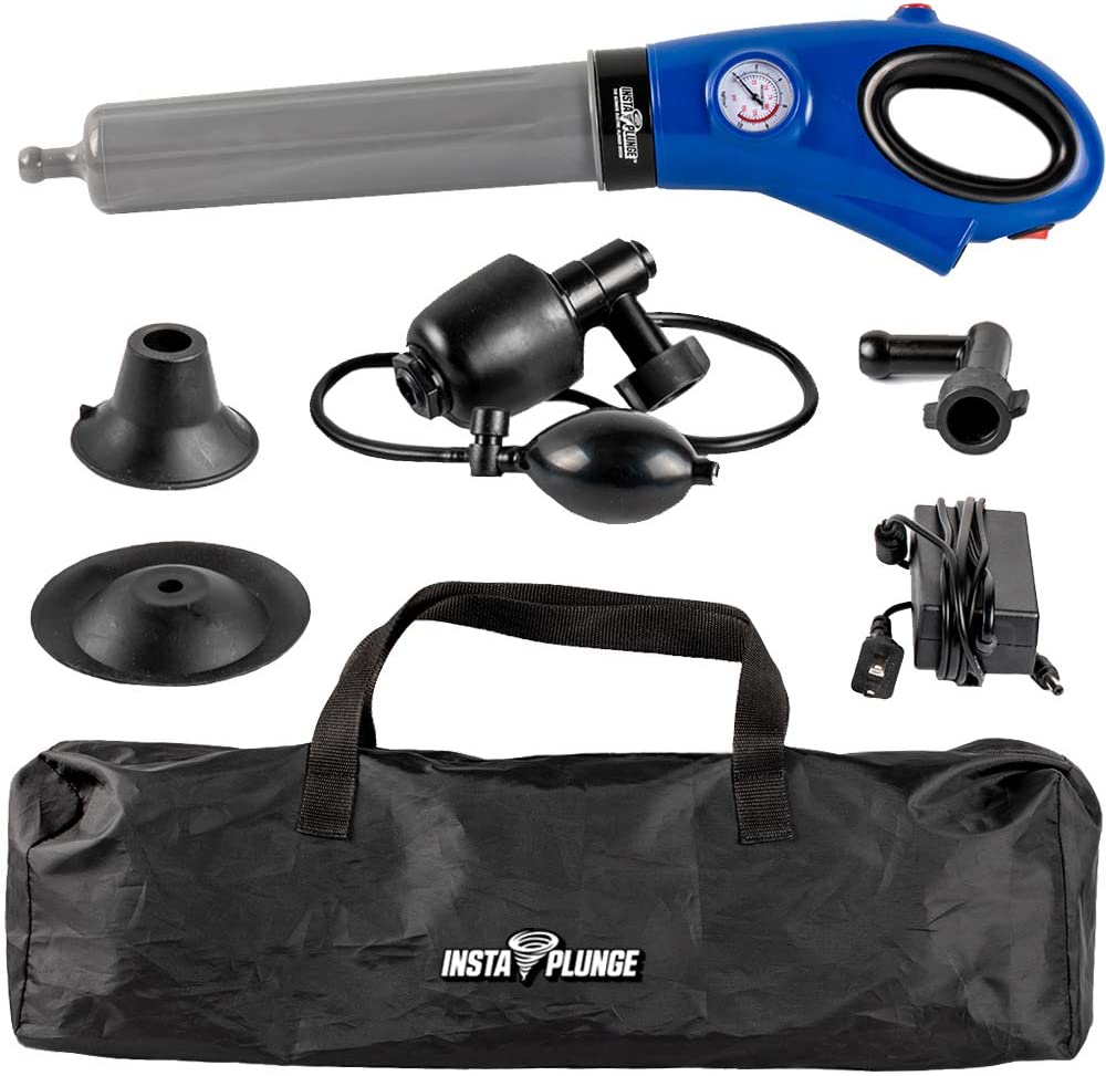 InstaPlunge Electric Plunger easily clears toilet and drain clogs with a push of a button, never call a plumber again! It works by automatically filling up with air pressure at the desired PSI in seconds and with a push of a button a blast of air is sent through your pipe to push the blockage through to clear and open the pipe.