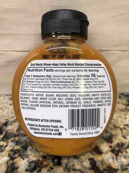 Ingredients: Water, Sugar, Mustard Seed, White Distilled and Balsamic Vinegar, Honey, Wheat Flour, Salt, Lemon Juice, Xanthan Gum, Citric Acid, Onions, Artificial and Natural Flavors, Soybean Oil, Garlic, Turmeric, Paprika, Spices, Calcium Disodium EDTA (Retains Product Freshness), Annatto.