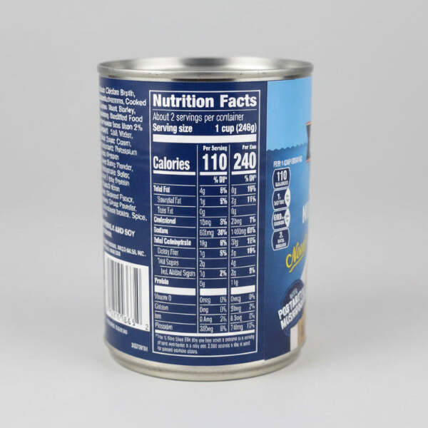 Chicken Broth, Portabella Mushrooms, Cooked White Chicken Meat, Barley, Onions, Celery, Modified Food Starch, Contains Less than 2% of: Soybean Oil, Salt, Water, Chicken Fat, Sugar, Cream, Mushroom Extract, Potassium Chloride, Soy Protein Concentrate, Garlic Powder, Sodium Phosphate, Butter, Sunflower Oil, Soy Protein Isolate, Whey Protein Concentrate, Natural Flavor, Dried Parsley, Onion Powder, Spice, Pea Protein Isolate, Spice, Rice Flour.