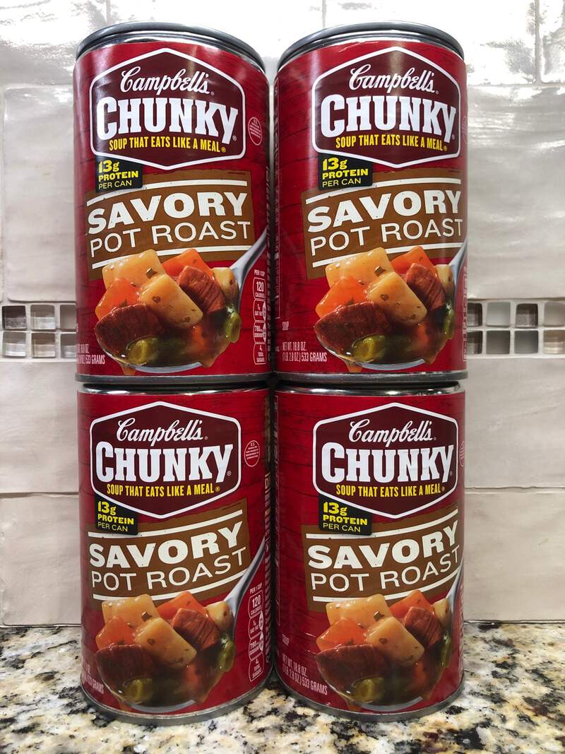 Campbell’s Chunky Savory Pot Roast Soup takes the flavors of a favorite home-cooked meal and makes it easy to serve to fuel your everyday hustle. Seasoned and simmered with potatoes, carrots and tender beef, you can count on plenty in every satisfying bite of this ready to eat soup. Enjoy on its own or take it up a notch by pouring it over mashed potatoes. Campbell's Chunky Savory Pot Roast Soup-Soup That Eats Like a Meal. When you need food that works as hard as you do, grab Campbell's Chunky soups. Our big flavor, big pieces and bold ingredients will help you fight back when NFL-sized hunger hits. Available in hearty varieties and tastes that don’t stop, Campbell's Chunky soups fill you up and fuel your everyday hustle.