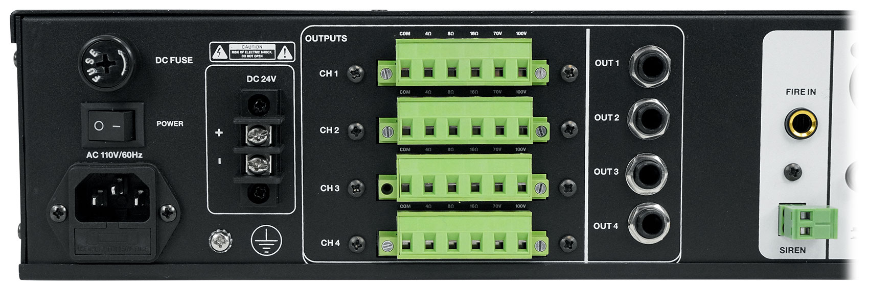 The built-in clipping limiter function protects your speakers and the amp from overheating. For further protection, there is also a cooling system in this amplifier that will keep the components running cool making the amplifier durable and reliable. There is a Fire input and a Siren input. This allows you to easily integrate a fire alarm and play a pre-recorded message that will override any music playing in case of an emergency. There is also a backup DC24V power input that allows you to connect a backup 24V battery that will kick in and power the unit in case of a power outage.