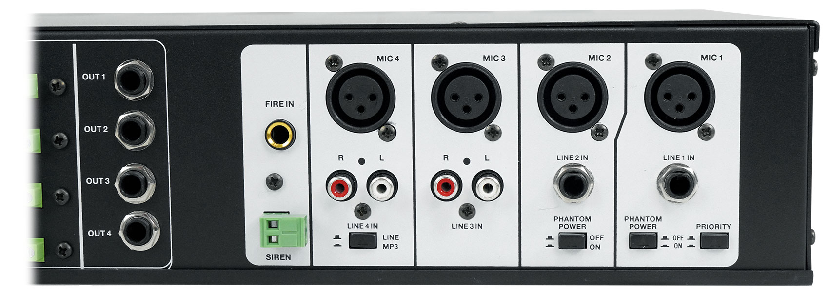 This model gives you Bluetooth, USB, SD, (2) Sets RCA AUX inputs, (4) XLR Mic inputs, (2) 1/4" TS inputs, (4) 1/4" TRS LINE outputs (one per zone), Fire input, and a Siren input. There is also a backup DC24V power input in case of a power outage.