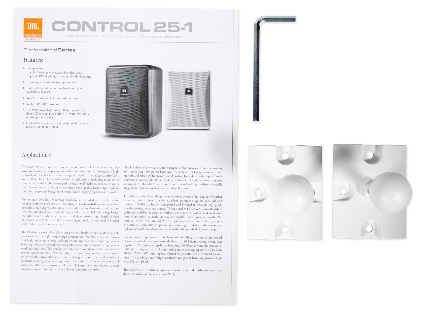 Designed by JBL, these Control 25-1 loudspeakers are two-way 5.25" indoor/outdoor monitors featuring weather-protected circuitry, natural and powerful representations of the frequency spectrum, white enclosures, and JBL's proprietary InvisiBall mounting hardware. This hardware allows you to install the speakers through a hidden access point behind its logo badge. As such, the Control 25-1 suitable for venues, health clubs, theme parks, cafes, or anywhere where foreground/background music—and paging—is a necessity.