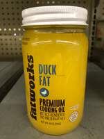 THE DIVA: With her elegance and her sophisticated deliciousness, Duck Fat is unquestionably the Diva of the Fatworks family. Creamy and delicate, yet with a high smoke point, she is surprisingly robust for an oil so seductive. But this is no high maintenance prima donna. In fact, the Divine Duck is a pleasure to cook with. To prove it, here's one of her classic dishes: Coat your veggies in Fatworks Pasture Raised Duck Fat, roast for about 20-25 minutes, add a pinch of sea salt. Voilà...a performance for the ages! The best way to add a little Ohh-La-La to your cooking is to cook with Duck Fat. Just mention "Duck Fat fries" and people lose their minds. Besides fries duck fat is great for confit style dishes, roasted veggies, and savory pies. You can even spread it on a "quacker" with a little sea salt. We source specially bred ducks that are raised to forage on land rather than water, raised with room to roam, socialize, run around, preen their feathers and be just about as ducky as any duck could wish. It should be noted that almost ALL ducks raised in the U.S. are cage free and are by law hormone and antibiotic free. What separates our cage free duck fat from our competitors is our small batch, kettle rendering and our advanced fine-filtering system creating the purest, BEST TASTING cage free duck fat on the market!