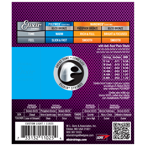 • Our coating technology protects against common corrosion and debris buildup, extending tone life longer than any other brand’s coated or uncoated strings (Elixir Strings player survey)