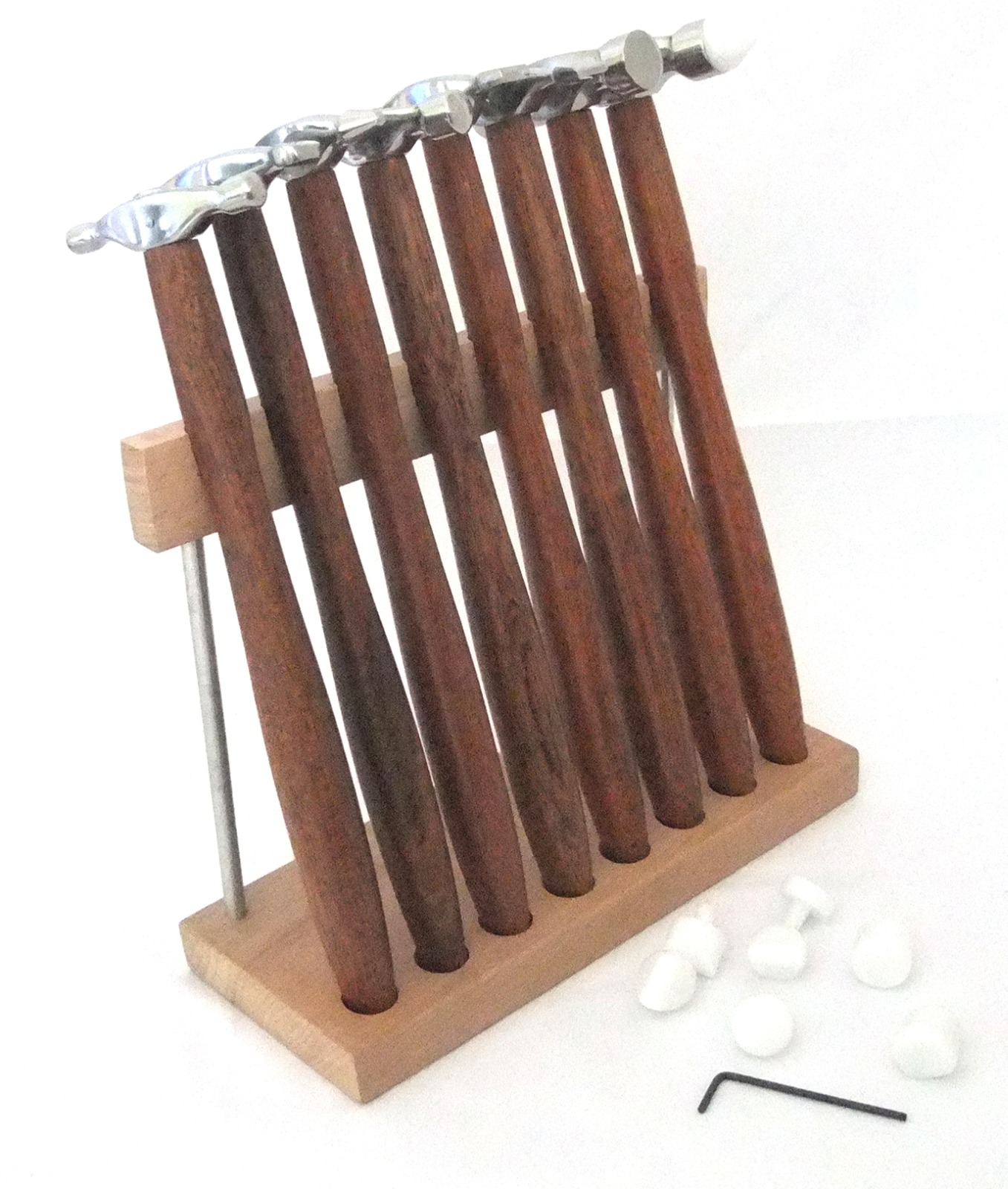 This nylon tipped forming hammer has an all-metal head with changeable nylon faces that will not mar your metal. The set includes nine nylon peg inserts in a variety of shapes that are easily changed and secured by a set-screw. Perfect for raising, plaishing and embossing work. Hammer weight 4 oz with two nylon tips attached. Overall length 9.5 inches.