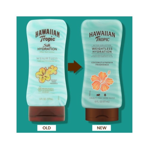 Hawaiian Tropic Silk Hydration Weightless after sun is a moisturizing after sun with lotion and gel ribbons that feels as if it is barely on.