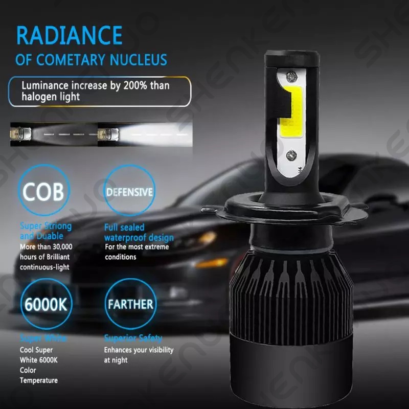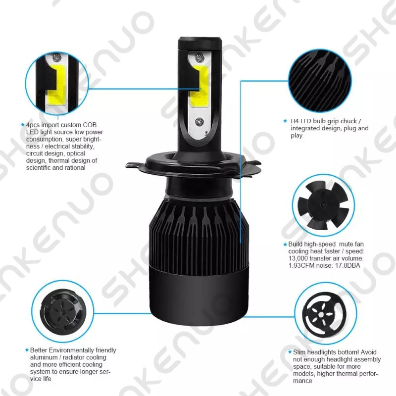 Specifications: Plug Type: H4 9003 (High Beam and Low Beam) +9145 (fog light) 1.Wattage:50W/Bulb 100W/Set 2.Lumens: 6000LM/Bulb 3.Shakeproof and Long lasting up to 60,000 Hours. 4.Color Temperature: 6000K White 5.Voltage: DC 9-32V ( Fit 12V,24V Vehicle ) 6. LED type: SHENKENUO COB Chips. 7.Built-in Fans & Ballasts , No Other Fans & Ballasts Required,Smart Efficient Cooling System Fast Heat Dissipation. 8.Low Voltage Protection, High Precision Constant Current driver Chip 9.Easy installation,Just Plug and Play. Automotive LED Bulbs advantages: 1. LED lights than traditional halogen energy, more bright . High focus and max light output with a wider and farther lighting area, Safer Night Driving. 2. Xenon lamp brightness and proximity , but the LED lights light up without delay, to enhance road safety. Instant start no strong currents impact , effectively protecting the car comes with a battery , improving battery life of more than 30%. 3. Fast cooling , the appearance of the most advanced design , thermal structure ingenious and reasonable.Power driver with wide voltage constant current mode , the car can respond to a variety of voltage instability , the effective protection of normal use Led efficient and simple structure. 4. Heating temperature is low , protect the car . Xenon working temperature up to 800 ° -1000 ° , the main reason for the car ignition 5. LED car headlights simple structure, fewer parts than xenon lamps, significantly lower than the xenon lamp failure rates ! Package Content: 4X LED Bulb 1.Compatible List can not show up all Car model. Please check the Correct bulb size of your vechicle. 2.If you are unsure your bulb type, please do remember send message to tell us your car make, model, year and other information which is helpful to check bulb type. |