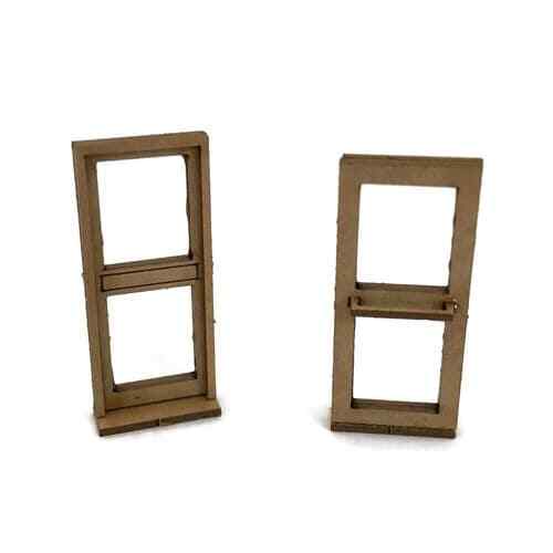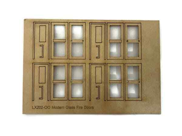 Laser cut from 0.8mm laserboard with realistic engraved detail to the door front, and separately fitted fire escape bar type handle to the rear & step at the base. Easy to assemble from just four parts per door. Can be glazed using the clear cellophane that the kit is supplied in. Ideal for scratch-building projects & detailing card, plastic & wooden model buildings.