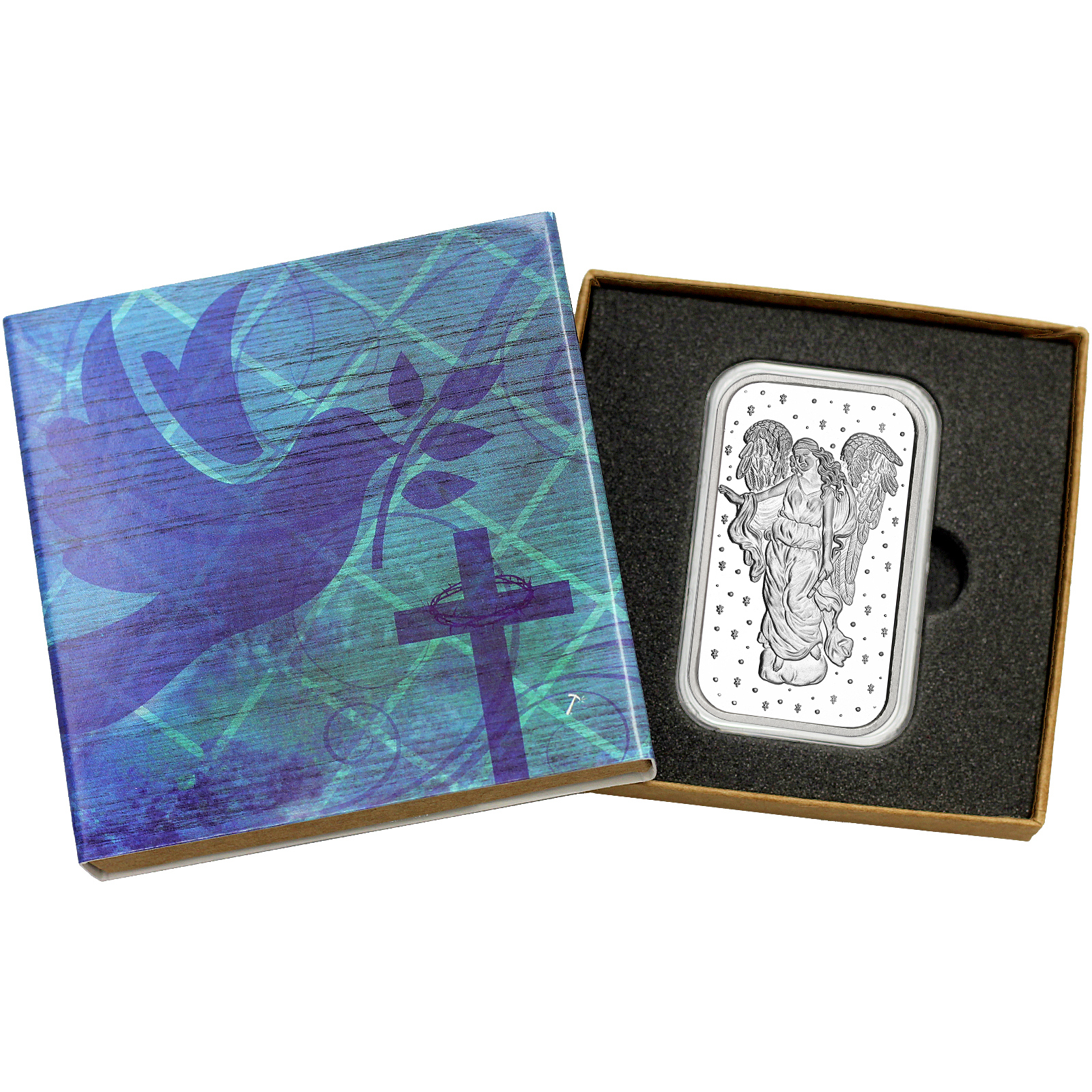 Your Guardian Angel Silver Ingot will arrive in a protective plastic capsule inside of our SilverTowne gift box with natural kraft paper made from recycled materials in the USA. A premium dark grey foam insert holds your bar snug inside the box. Topping off the gift box is a custom fitted sleeve featuring a Religious theme with a dove and a cross.