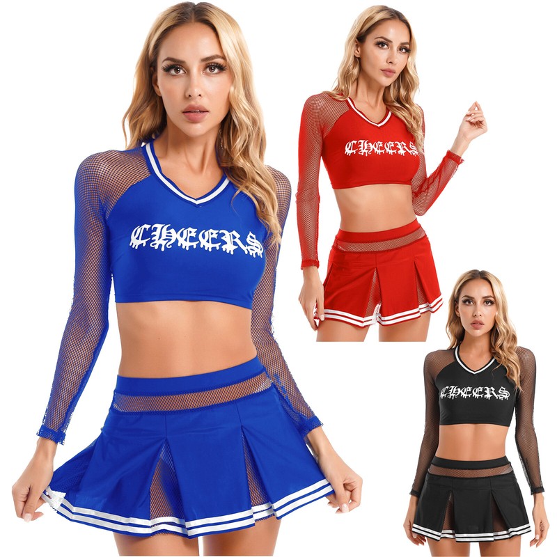 Women Cheerleading Role Play Outfits Striped Cutout V Neck Crop Top with Low Waist Pleated Skirt G-string.