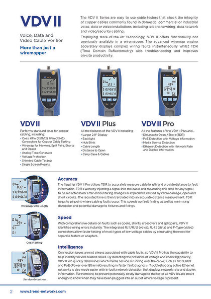 The VDV II Series are easy to use cable testers that check the integrity of copper cables commonly found in domestic, commercial or industrial voice, data or video installations, including telephone wiring, data network and video/security cabling.