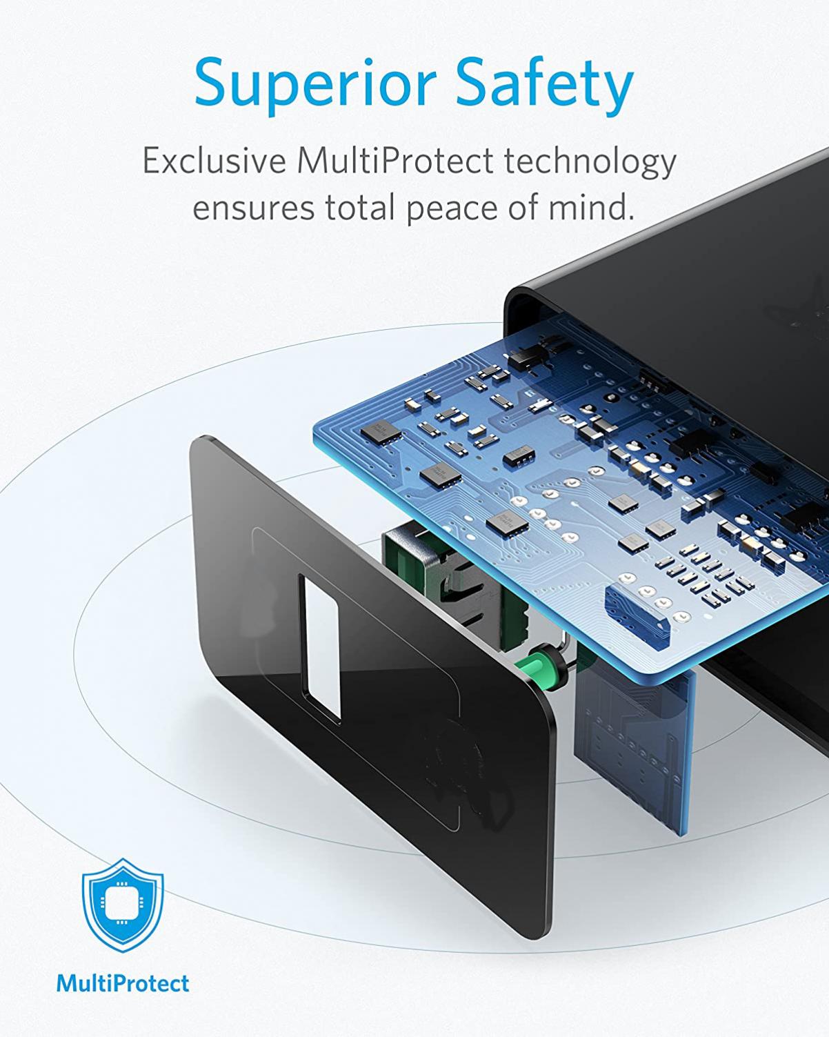 - Multiple built-in safeguards (CE/ FCC/ RoHS/UL certification) and intelligent IC s technology protect against short circuit, over-current, over-voltage, over-heating, and over-charging.