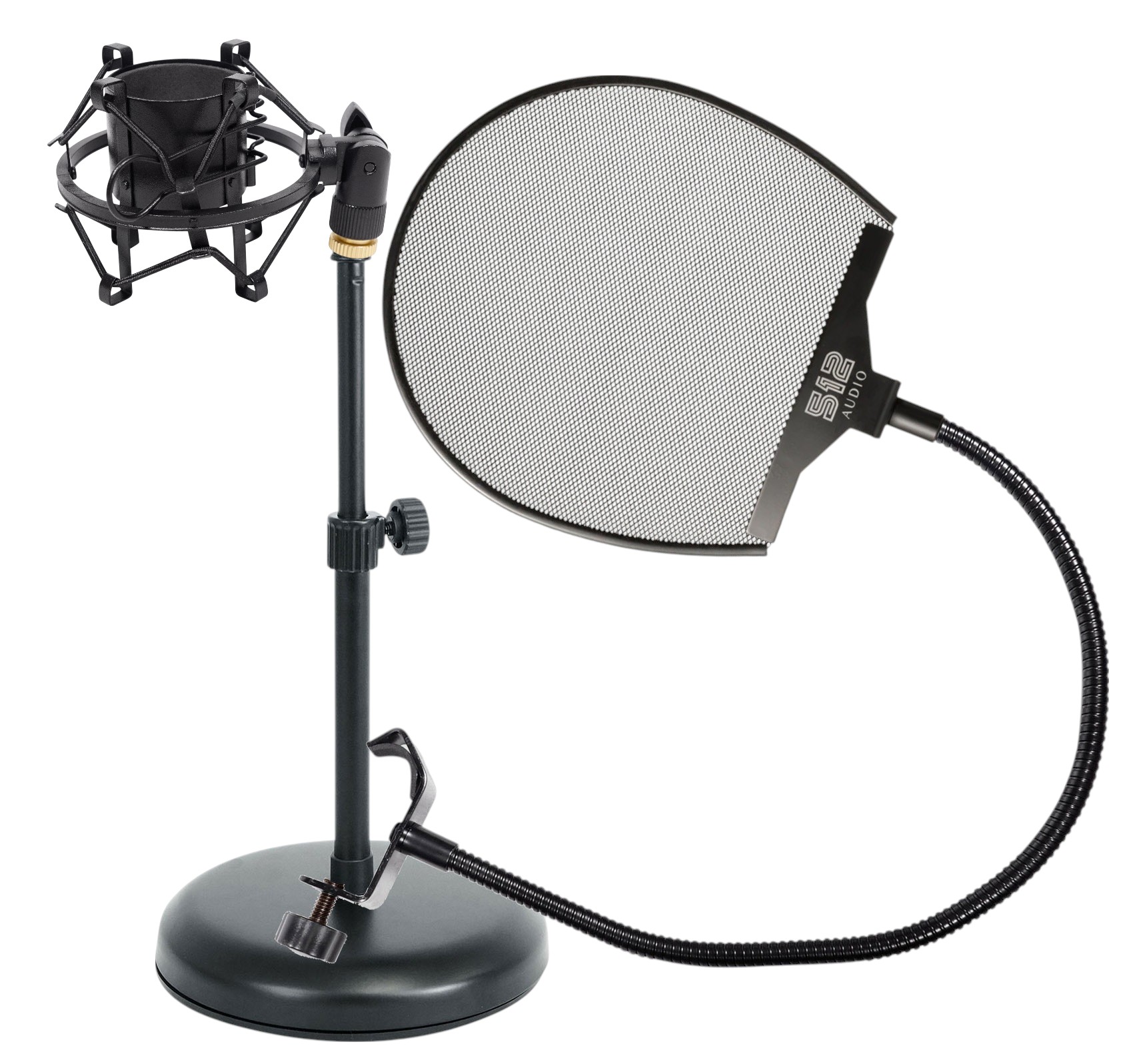 Package Includes: (1) Rockville iStand 7 iPad/iPhone/Tablet Adjustable Desktop Studio Stand+Mic Clip+(1) 512 Audio Warm Audio 512-POP Professional Metal Pop Filter w Gooseneck Clamp+(1) Rockville RockShock Black Studio Condenser Microphone Metal Shock Mount w/Foam