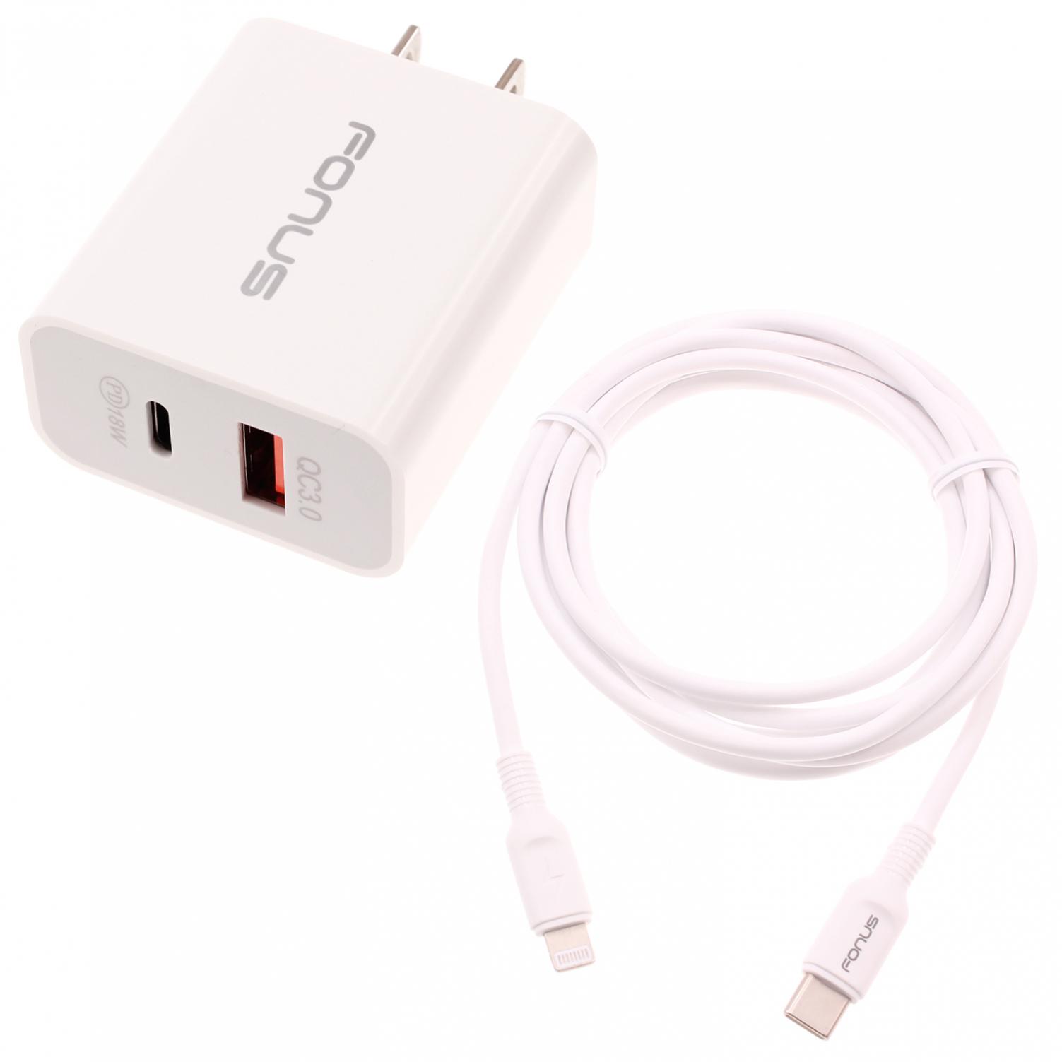 36W PD Fast Charger Home Wall Adapter 6ft Long Type-C USB Cable USB-C Cord 2-Port White. 36W Adaptive Fast USB Charger is the latest design from our Fonus fast charging product line up. One Quick Charge Type-C Port (18W) and One Quick Charge USB-A Port (18W). Equipped with the latest Fast Charge technology, the Fonus wall charger offers blazing fast charging for QC compatible devices. You can get 75% phone battery charged in as short as 30 minutes, while conventional charger can take up to an hour and half. As powerful as it can be, the charger is also loaded with all the necessary features to give you a 100% safe charging experience: durable casing to protect damages from outside, high temperature, high current and voltage surge protection to guard internal circuit. Comes with a 6ft Long Type-C to iPhone Cable.