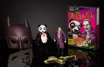 This Comic Con exclusive includes 2 6-inch figures—The Joker and Panda Man. Both are highly articulated reproductions from the movie. Panda Man features flocking on his body and a riffle accessory. A Bat Mask is included in the window box display package.