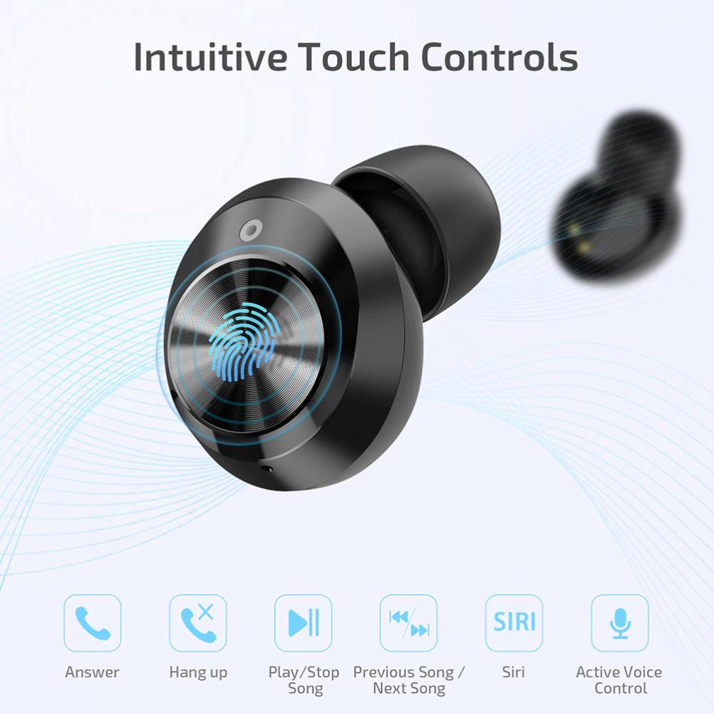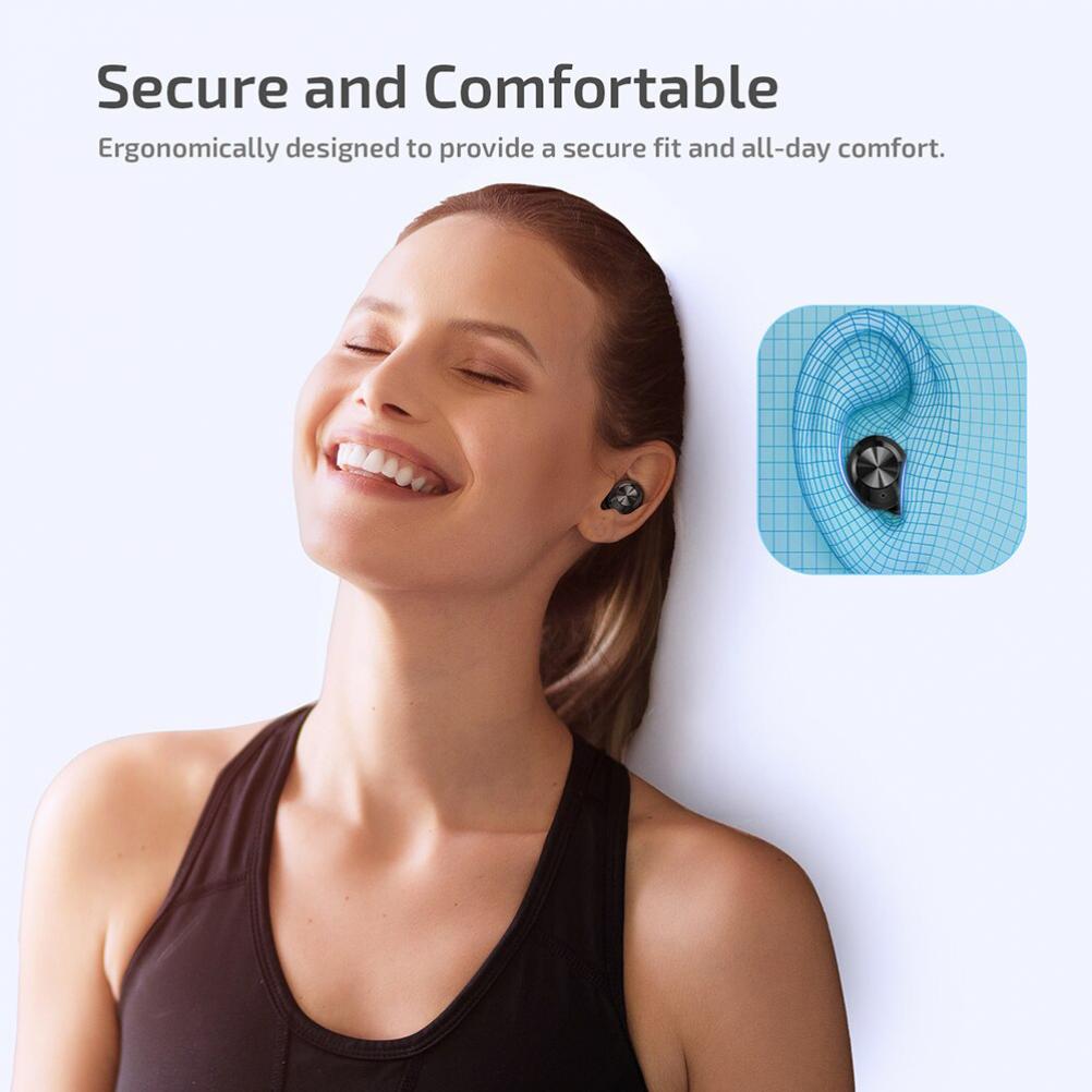 TWS Earbuds Wireless Earphones Headphones Charging Case True Stereo [Easy Pairing]. True Wireless Earbuds technology transmits music from your phone to the headphones, so music plays reliably and consistently whether your phone is in your nearby gym bag, pocket or strapped to your arm, and provide clearly superior sound with powerful deep bass. Easy control - Tap, press or voice command, no need to get through the cell phone interface. Up to 5.5 hours of play time with single charge and an additional 28 hours with the included portable charging case. Equipped with different Silicone fits and IPX5 sweat-water resistance, these wireless earbuds are made to fill your workouts with your favorite music without getting in the way. No wires. No stopping you. HD microphones are built-in for clear and uninterrupted calls, all the unnecessary and surrounding noises will be suppressed completely through our microphones.