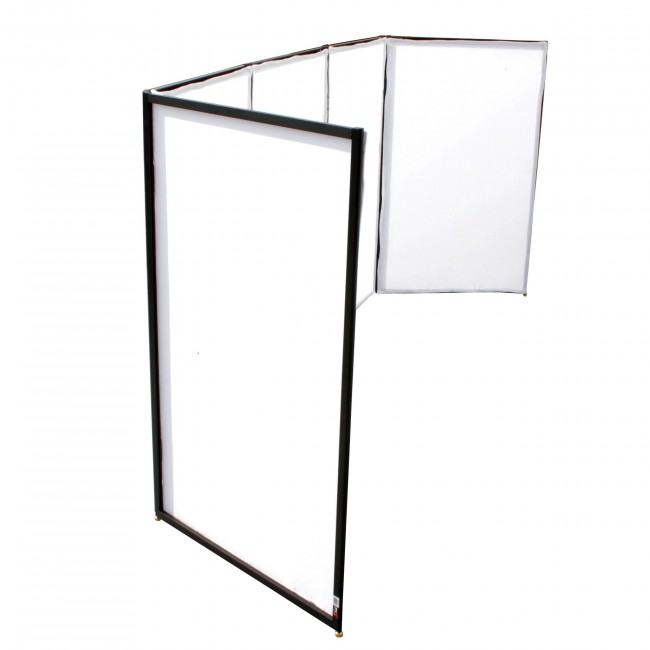 After the initial one time assembly, this portable 5-panel facade is a breeze to set up and tear down with its stainless steel, 180-degree quick release hinges. It not only comes with its own carry case but also carry bags for both the white and black scrims. Each panel's dimensions are 30” x 48”