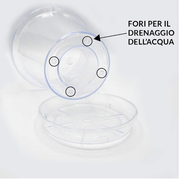 Il Vaso ha un diametro di 14 cm o di 16 cm, è realizzato in plastica, presenta un fondo rialzato per orchidea ed è completo di 4 fori per il drenaggio dell’acqua.