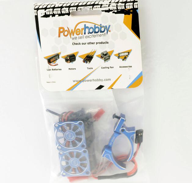 Twin motor cooling fans with motor mount fits 1/8 scale motor with a diameter of 40-42mm and power connector can plug directly into any open channel of the receiver or BEC, it can reduce the temperature of the motor quickly and get the motor as cool as possible. Pushing your 1/8 scale car to the limit!
