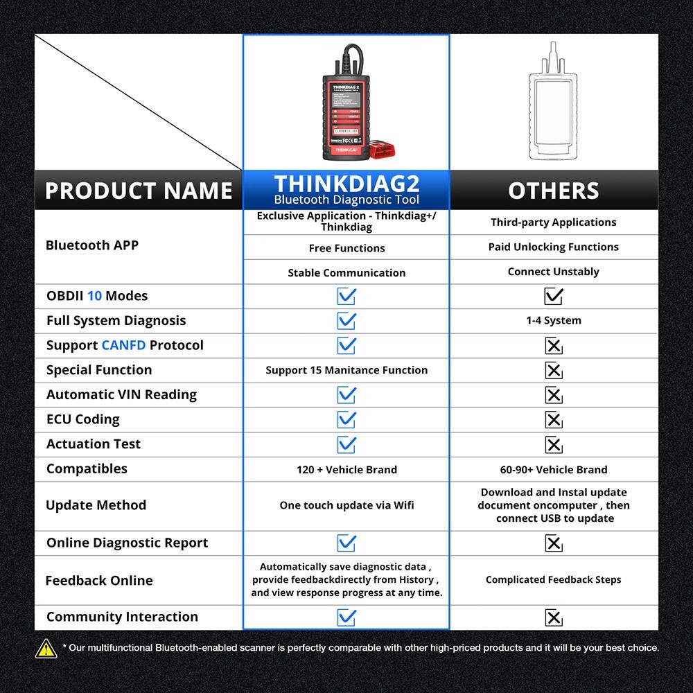 Full System OE level functionsThinkDiag 2 Enhanced diagnostic scanner can perform OE-level diagnostics on all systems, such as ABS, SRS, Engine, Transmission, Wiper, Seat, EPB, TPMS, Body System, AWD, Door Lock System, Battery, ESP, Parking Sensor, Cruise Control, Instrument, etc.