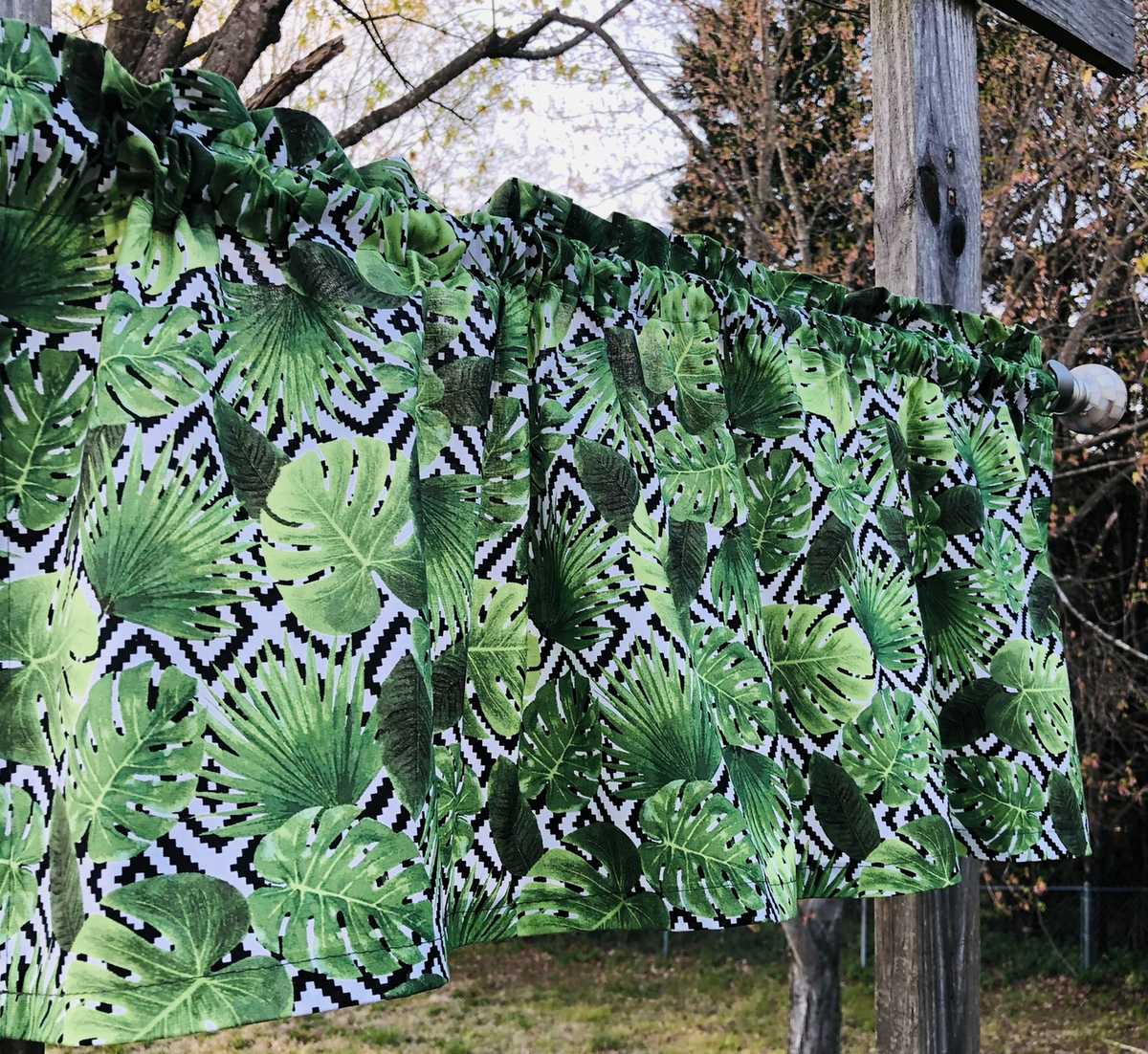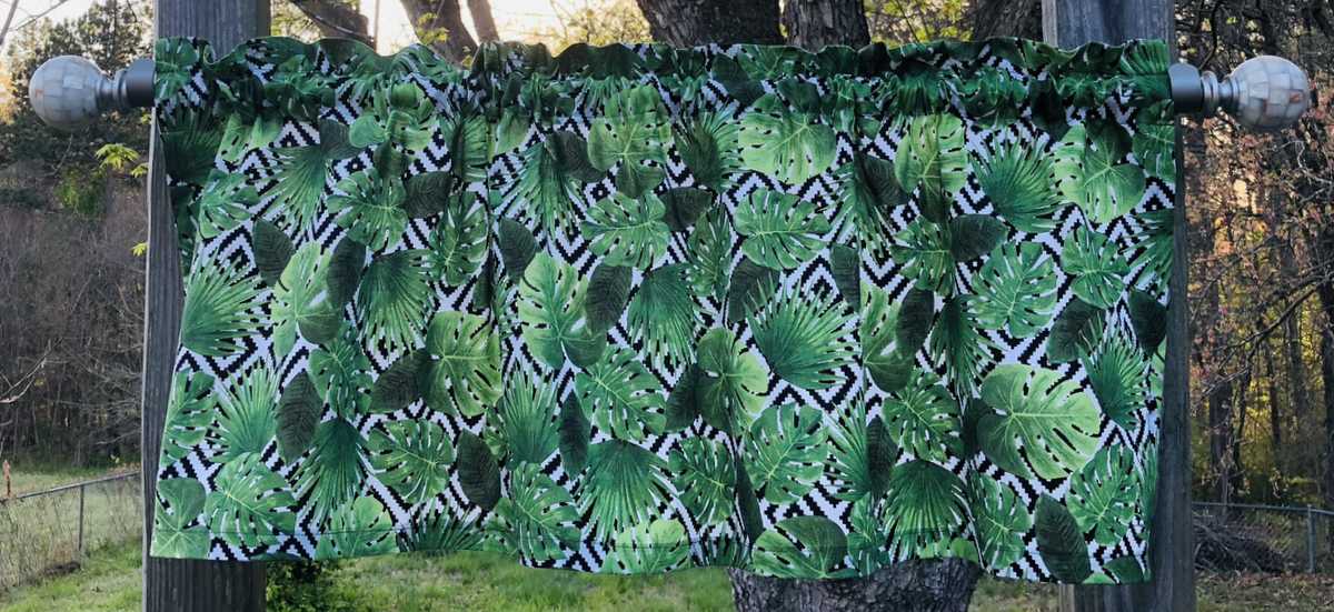 Tropical Green Leaf Valance Leaves on Black White Kitchen Bath Cotton Curtain Valance