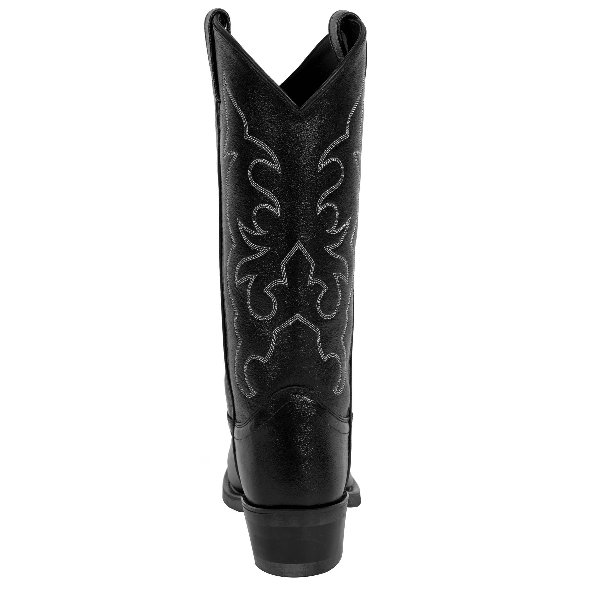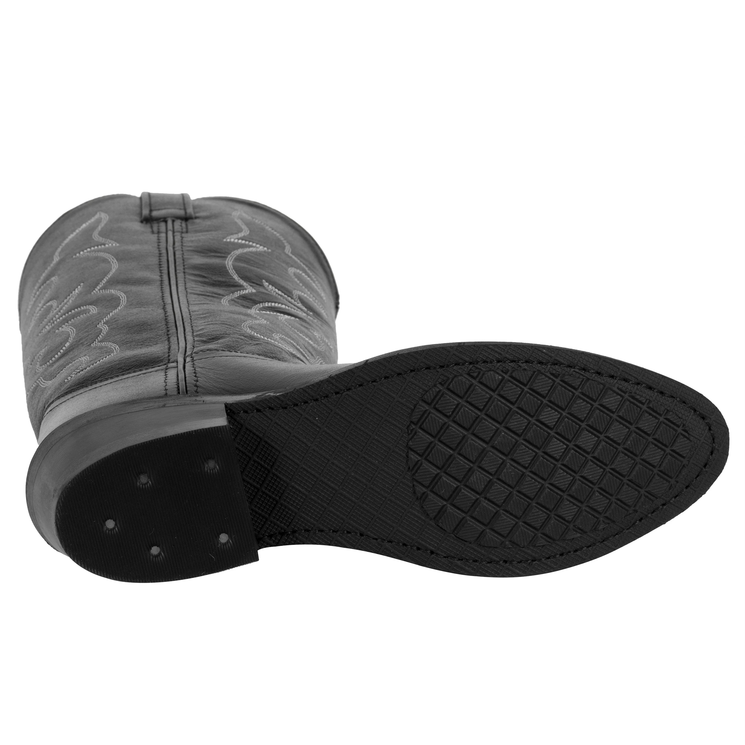 These authentic western black leather mens cowboy boots from Old West feature a narrow round toe, cowboy heel, and tough work outsole. Constructed from high quality leather and man-made materials, these boots are made to last. For a traditional western look with style, these boots are the perfect choice.