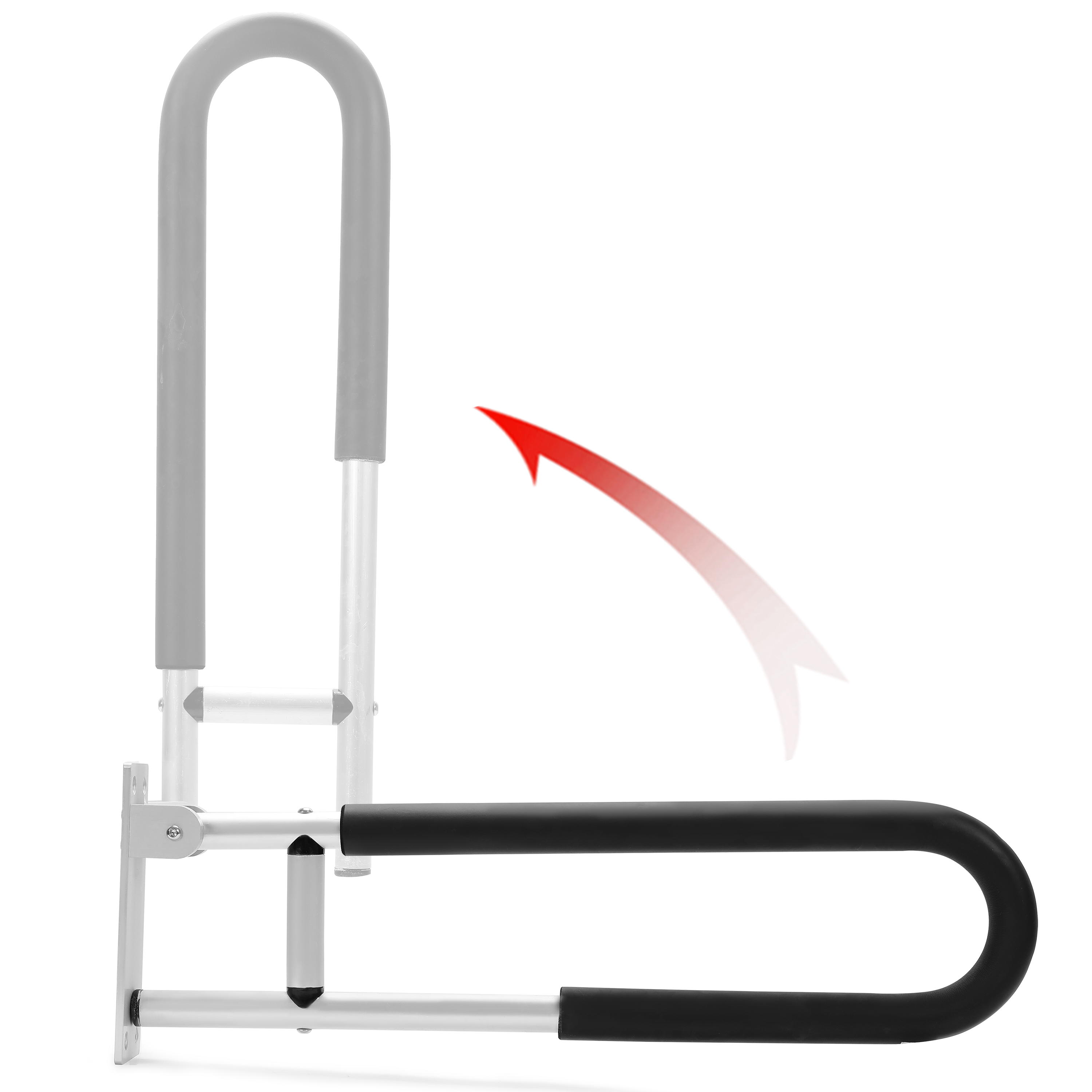 The folding grab bar can be turned over 90 degrees, and it can stand against the wall to save space when the pull bar is not used.