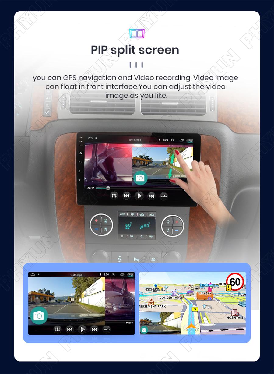 Display | - Touch Screen: Yes - Resolution: 1024*600 - Capacitive or Resistance Screen: Capacitive - Built-in Clock and Calendar: Yes, show real time and can use network-provided time - Main Menu Status Bar display: Can be changed to Music/Radio/BT-Stereo Player and Clock/Date/Week - Change Apps-Icon Position: Yes - Picture in picture split screen:Yes |