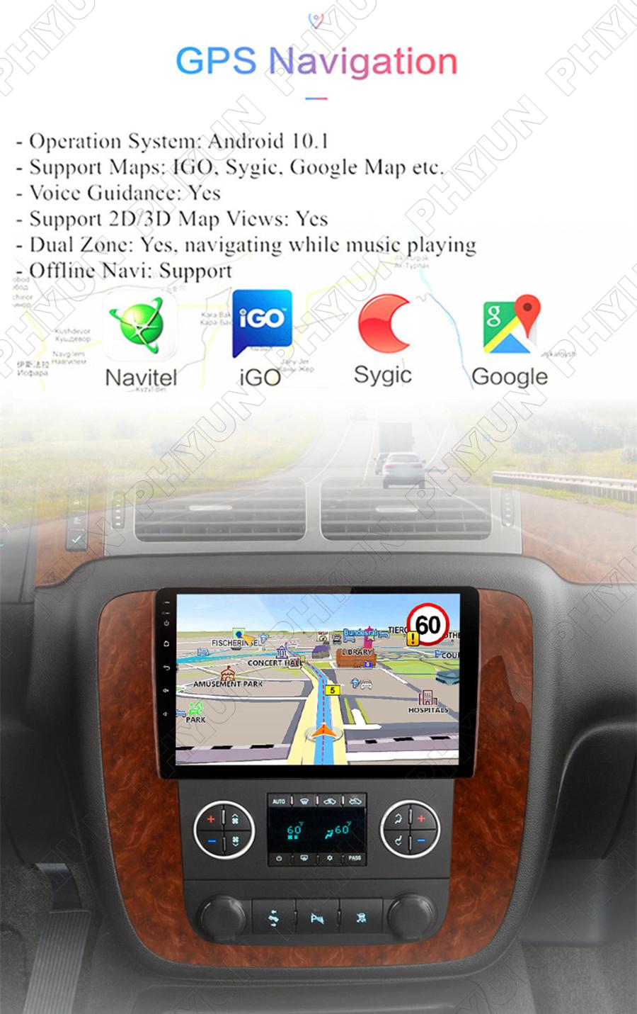 GPS | - Operation System: Android 10.1 - Support Maps: IGO, Sygic, Google Map etc. - Voice Guidance: Yes - Support 2D/3D Map Views: Yes - Dual Zone: Yes, navigating while music playing - Online Navi: Yes, support google maps online navigating |
