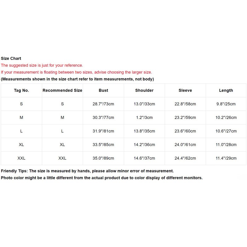 | Tag No. | Recommended Size | Bust | Shoulder | Sleeve | Length |