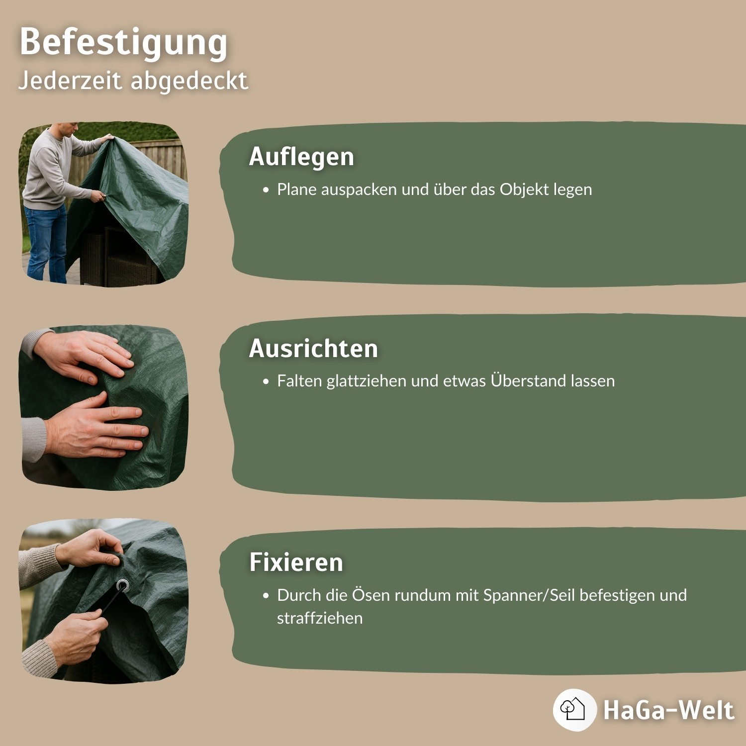 - Einfach zu befestigen: Mit Ösen in 100 cm-Abständen und verstärktem Rand für eine sichere und einfache Fixierung.