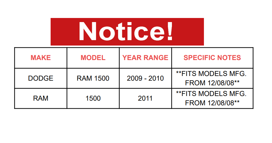 | DODGE | RAM 1500 | 2009 - 2010 | **FITS MODELS MFG. FROM 12/08/08** |