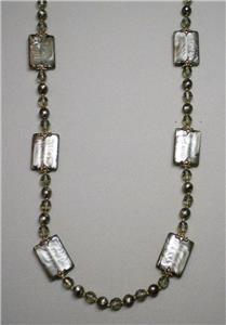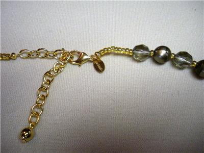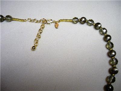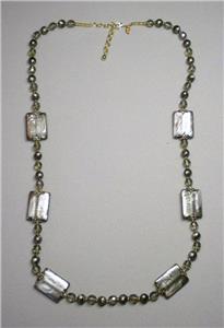 Up for bid is this beautiful Joan Rivers "Tango" necklace. It is gold plated with greenish goldish swirl and gray iridescent plastic faceted beads and large rectangle greenish goldish swirl beads. The necklace measures 35 1/2" (L) with a 3" extender by 1" wide.