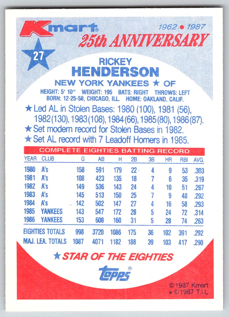 | 1987 Topps Kmart 25th Anniversary RICKEY HENDERSON #27 Yankees HOF - FREE Ship! | ||||||||||||||||||