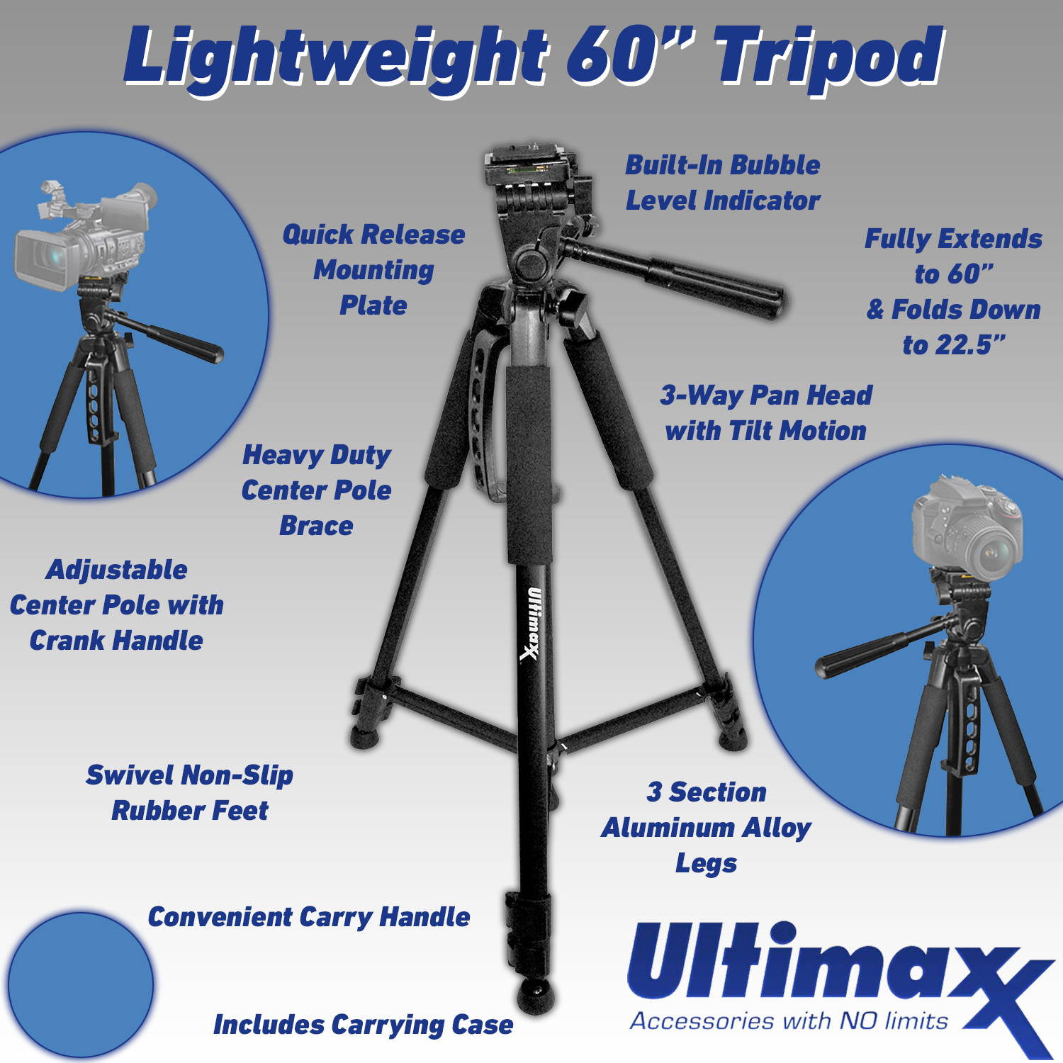 Fully Adjustable Locking Legs Quick Release Mounting Plate Built-in Bubble Level Indicator Adjustable Center Pole with Crank Handle Heavy Duty Center Pole Brace Foam Padded Legs 3 Section Aluminum Alloy Legs 3-Way Pan Head with Tilt Motion Convenient Carry Handle Accessory Hook Extends to 60” / Folds to 22.5” Lightweight & Compact Design |