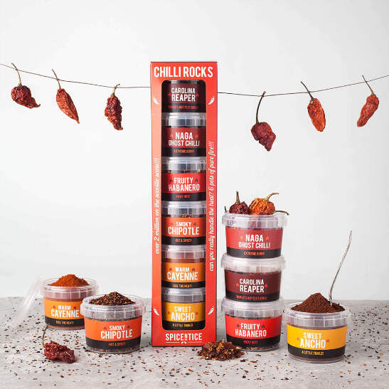This chilli gift set includes the world's hottest chilli and a range of other delicious spices from around the globe.