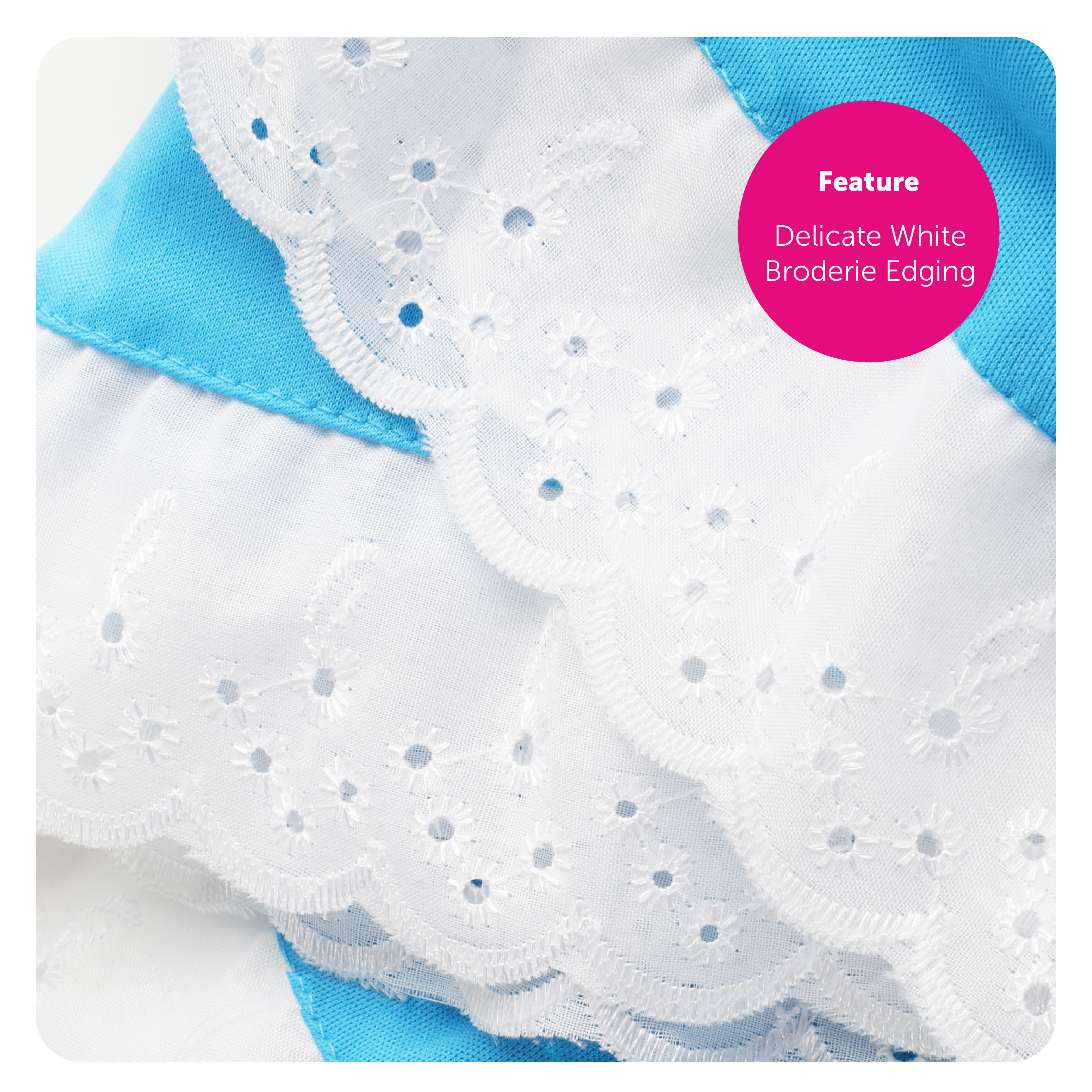 LONG BLUE DRESS WITH BRODERIE ANGLAISE TRIM, PUFF SLEEVES AND LARGE BLUE COLLAR