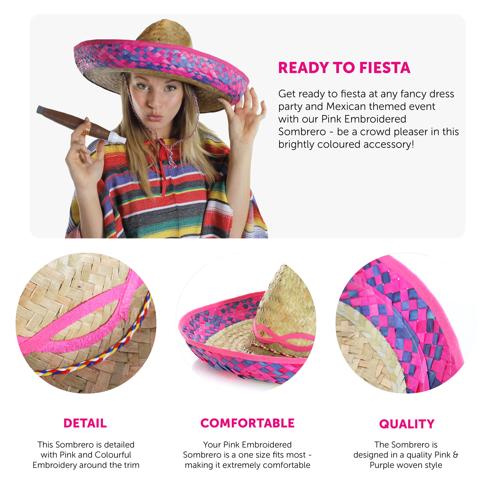 PINK EMBROIDERED SOMBRERO HAT: Take the fiesta and life of the party with you whether you go for your next big event or occasion with our Pink Embroidered Sombrero Hat and liven up any party or gathering!