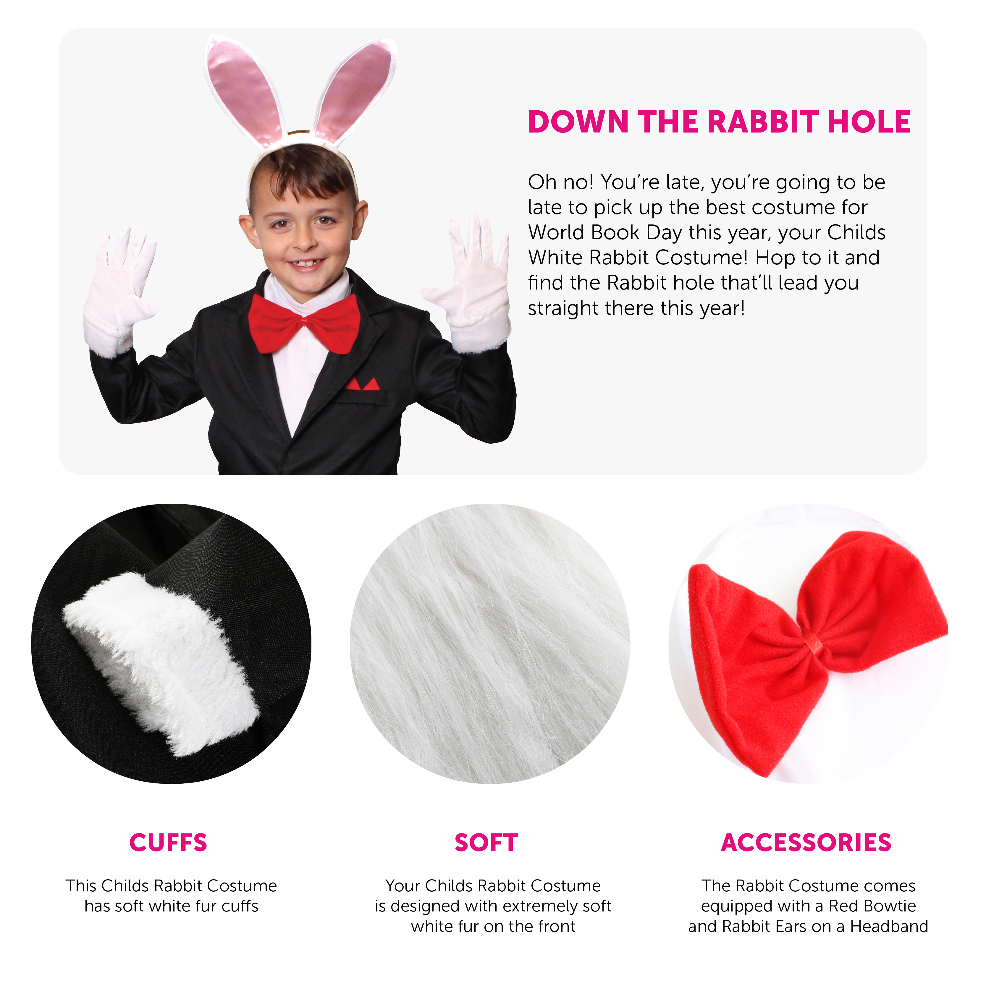 CHILDS WHITE RABBIT COSTUME: Oh no! You’re late, you’re going to be late to pick up the best costume for World Book Day this year, your Childs White Rabbit Costume! Hop to it and find the Rabbit hole that’ll lead you straight there this year!